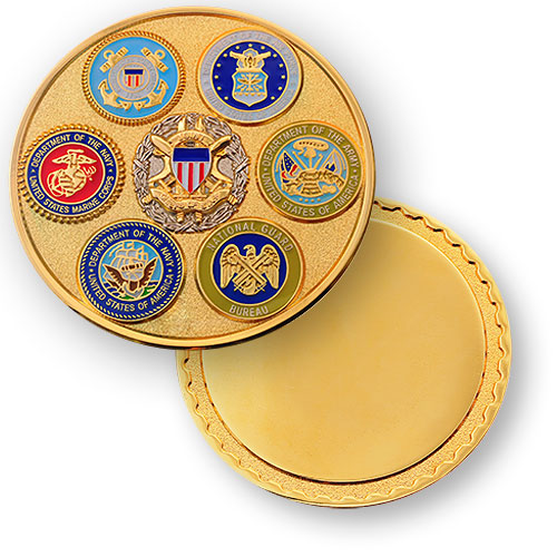 The U.S. Department of Defense is the hub of all five military branches. This coin has the seals of all branches and major departments. Our company has a proud heritage of being owned by a veteran and having employees who are directly related to military members; therefore we are proud to present this coin which brings all branches of the military onto one medallion.