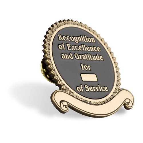 This 1.75" uniquely shaped antique brass lapel pin reads "Recognition of Excellence and Gratitude for __(years)__ of Service" highlighted on a black background, and is flanked by a pleated ribbon border. It comes complete with two butterfly clutch backings. This pin is perfect for recognizing years of service!