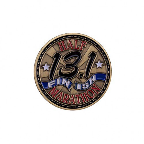 You trained. You ran. You conquered! The front of this 1.75” antique brass coin displays the red text "Half Marathon" and black text "13.1" tearing through a blue finish line ribbon...