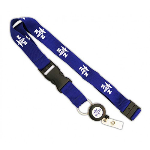 Our imprinted polyester lanyards for RNs are 36" long and feature a buckle release for easy use with keys, as well as a badge reel for quick scanning. This lanyard has white repeating caducei in between the letters "R" and "N" and is a rich blue color. This useful item makes a great gift for your favorite Nurse.