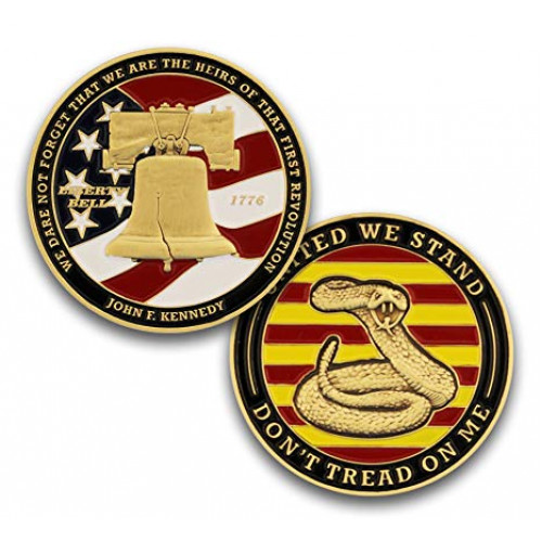 This 1.75" coin is a great American liberty and freedom piece. Featuring the liberty bell, the "Don't Tread On Me" snake, and the founding year of 1776. It also features John F Kennedy's quote "We dare no forget that we are the heirs of that first revolution". This coin makes a great gift or collectors piece.